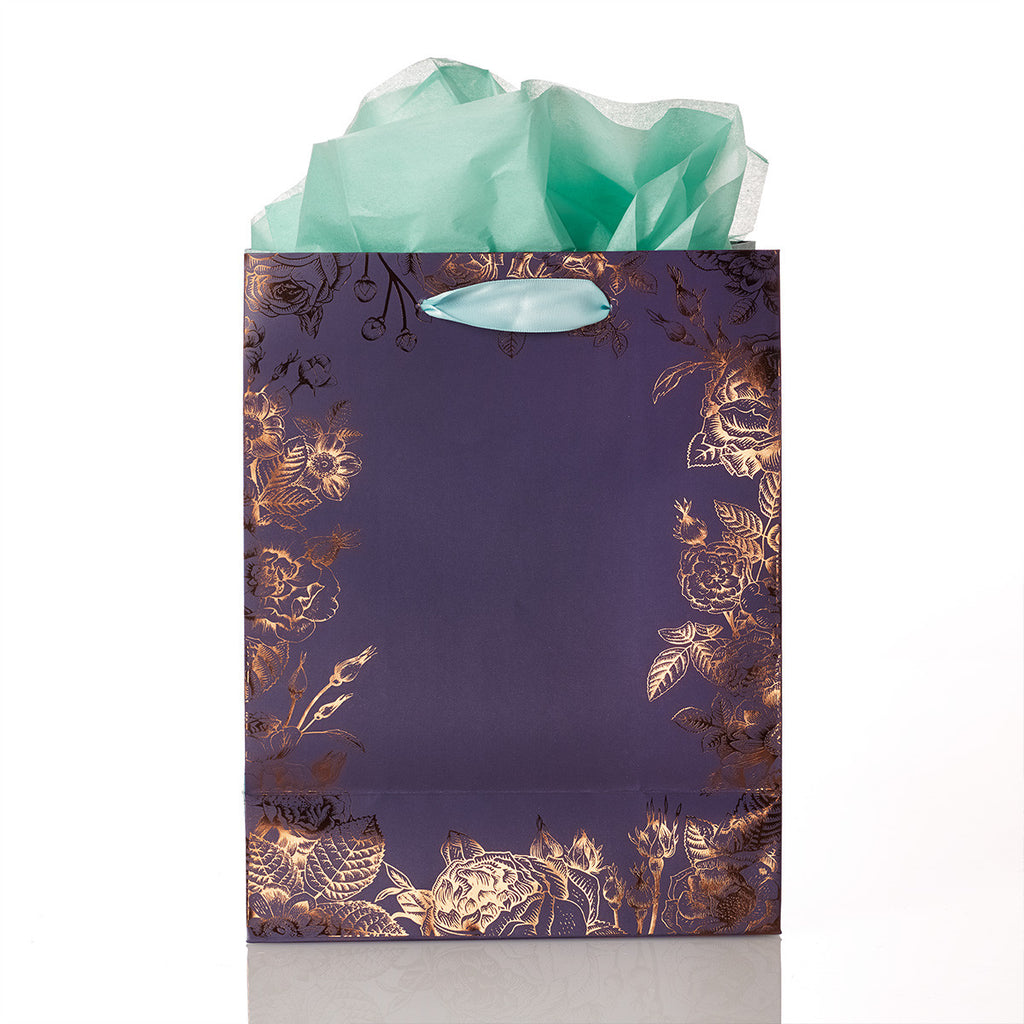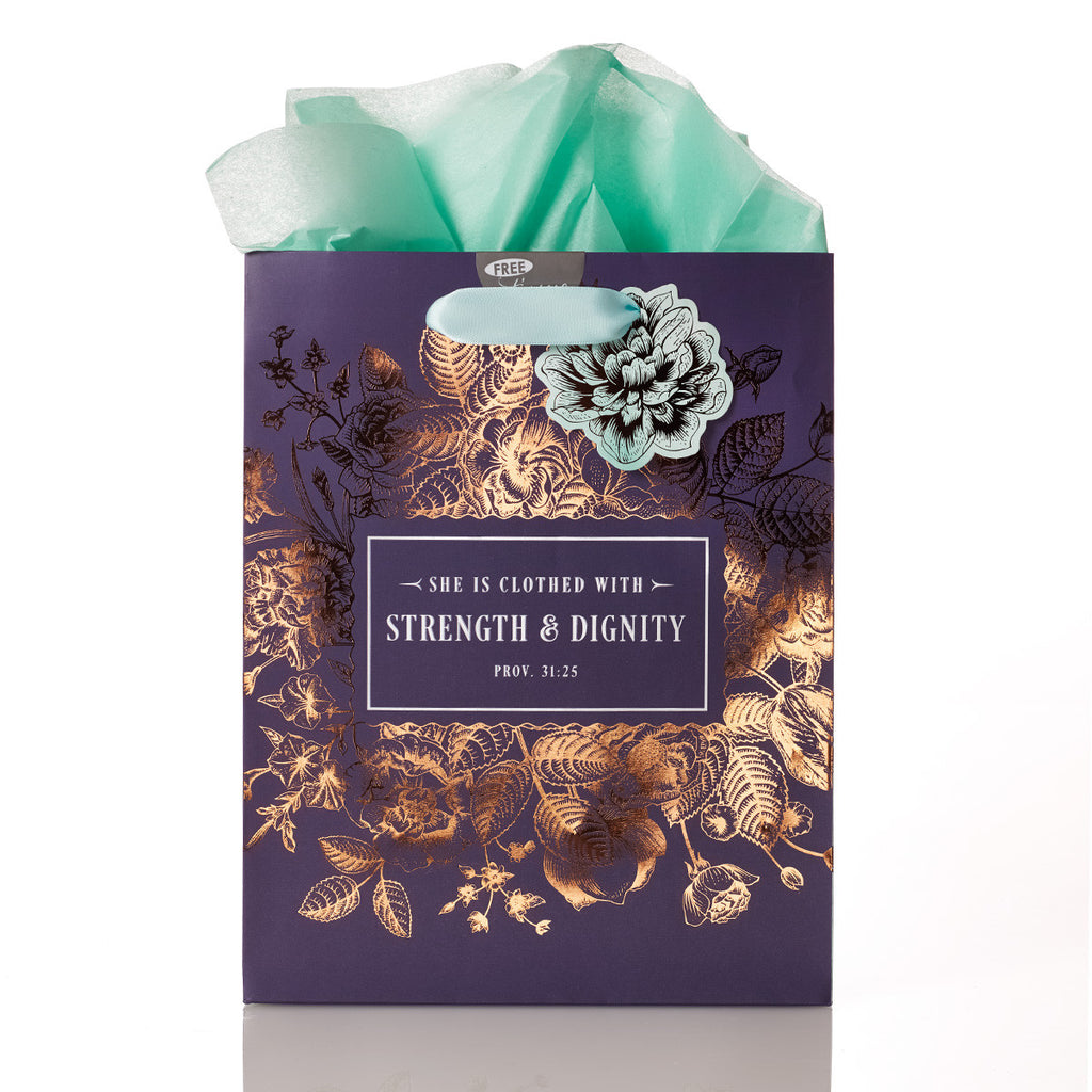 De Medium Gift Bag: Strength And Dignity – Proverbs 31:25 is warm vormgegeven met charmante bloemen en groen. De tas wordt geleverd met een vel blauwgroen vloeipapier om uw christelijke cadeau liefdevol in te pakken, een bijpassend cadeaulabel en twee satijnen blauwgroene handvatten om de bloemencadeautas eenvoudig van uw huis naar het huis van uw geliefde te vervoeren.