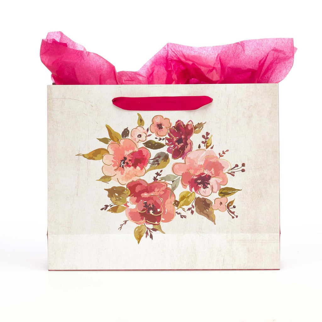 Een kleiner ontwerp in een vergelijkbare stijl is te zien op de achterkant, terwijl de zijkanten het lichte ontwerp doorbreken met contrasterende donkerroze panelen. De handvatten zijn gemaakt van bijpassende donkerroze satijnen linten. Het stevige gecoate papier zorgt ervoor dat deze duurzame cadeautas geschikt is voor het dragen van iets zwaars, zoals een ovenschotel, of iets lichts als een deken als beterschapscadeau. Een bijpassende blanco cadeaukaart met een envelop en een vel roze vloeipapier zijn inbegrepen voor uw gemak en om een uniform ontwerp te creëren.