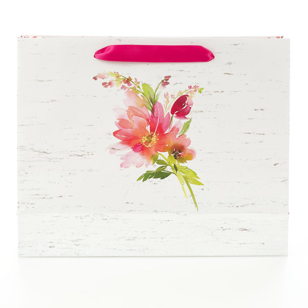 Roze folieaccenten geven een toch al mooie cadeautas een vleugje sprankeling. Op de achterkant staat een klein boeketje in dezelfde stijl en de zijkanten zijn versierd met een funky roze en oranje visgraatmotief.