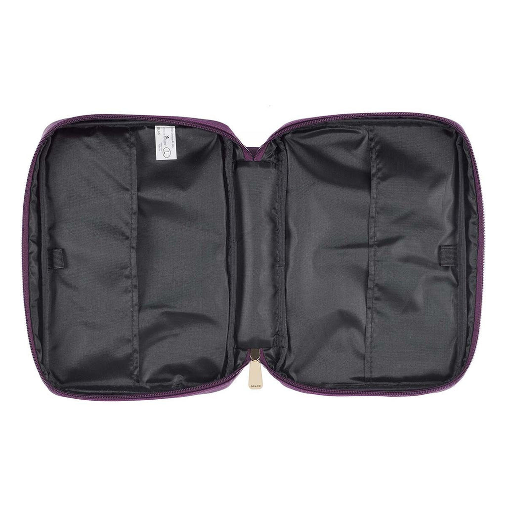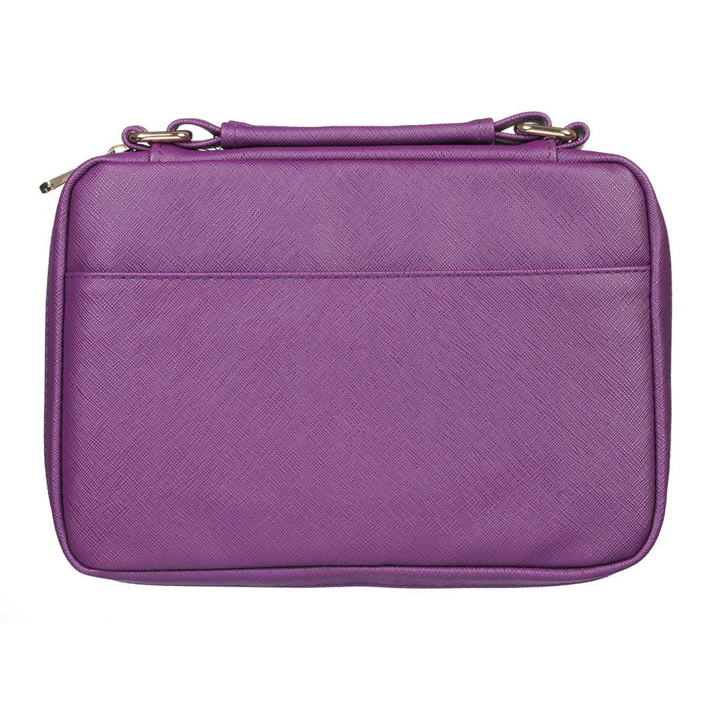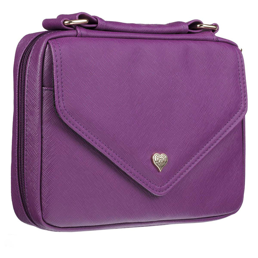 Een imitatieleren flap die lijkt op een envelopsluiting zorgt voor een aantrekkelijke uitstraling in deze volledig paarse Bijbelhoes. Een magneet sluit de flap af met een verborgen insteekvak. Een glanzend goudkleurig metalen hart met een ingewikkeld gegraveerd ontwerp geeft de paarse hoes een sprankelende uitstraling. Het getextureerde paarse imitatieleer dat in de constructie is gebruikt, imiteert de look van linnen en voegt een interessant textielelement toe aan het ontwerp van de Bijbelhoes. De platliggende handgreep van imitatieleer is bevestigd met goudkleurige metalen details. Een tweede zichtbaar insteekvak voor notities bevindt zich op de achterkant van de Bijbelhoes. Twee pennenlussen aan de binnenkant bieden ruimte voor een pen, potlood of markeerstift.