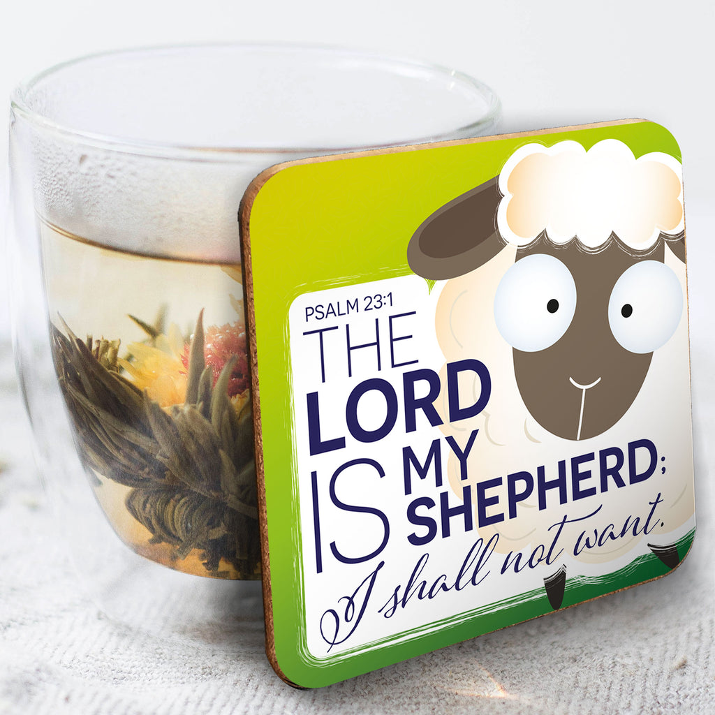 Tekst op de onderzetter: 'De Heer is mijn herder, mij zal niets ontbreken' - Psalm 23:1