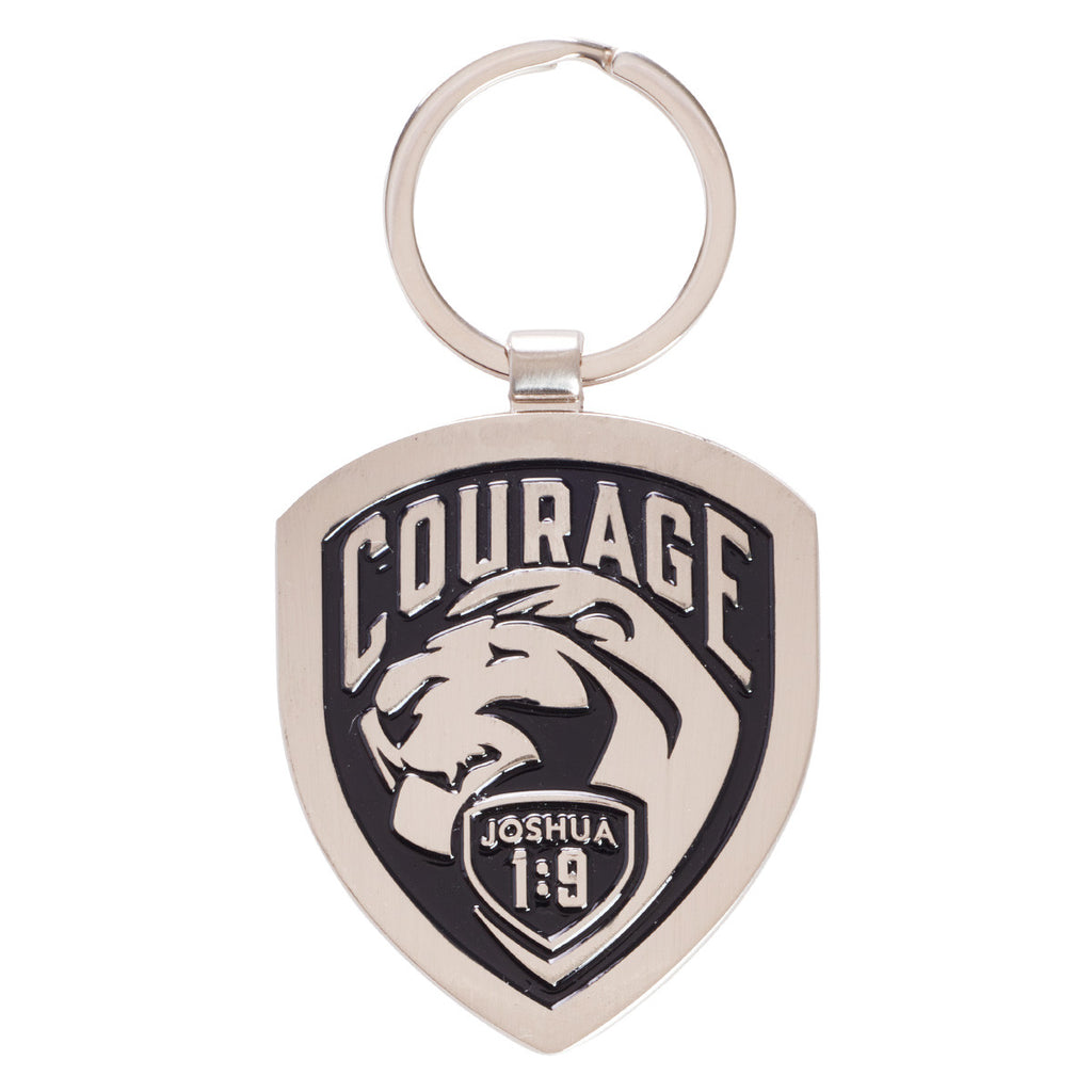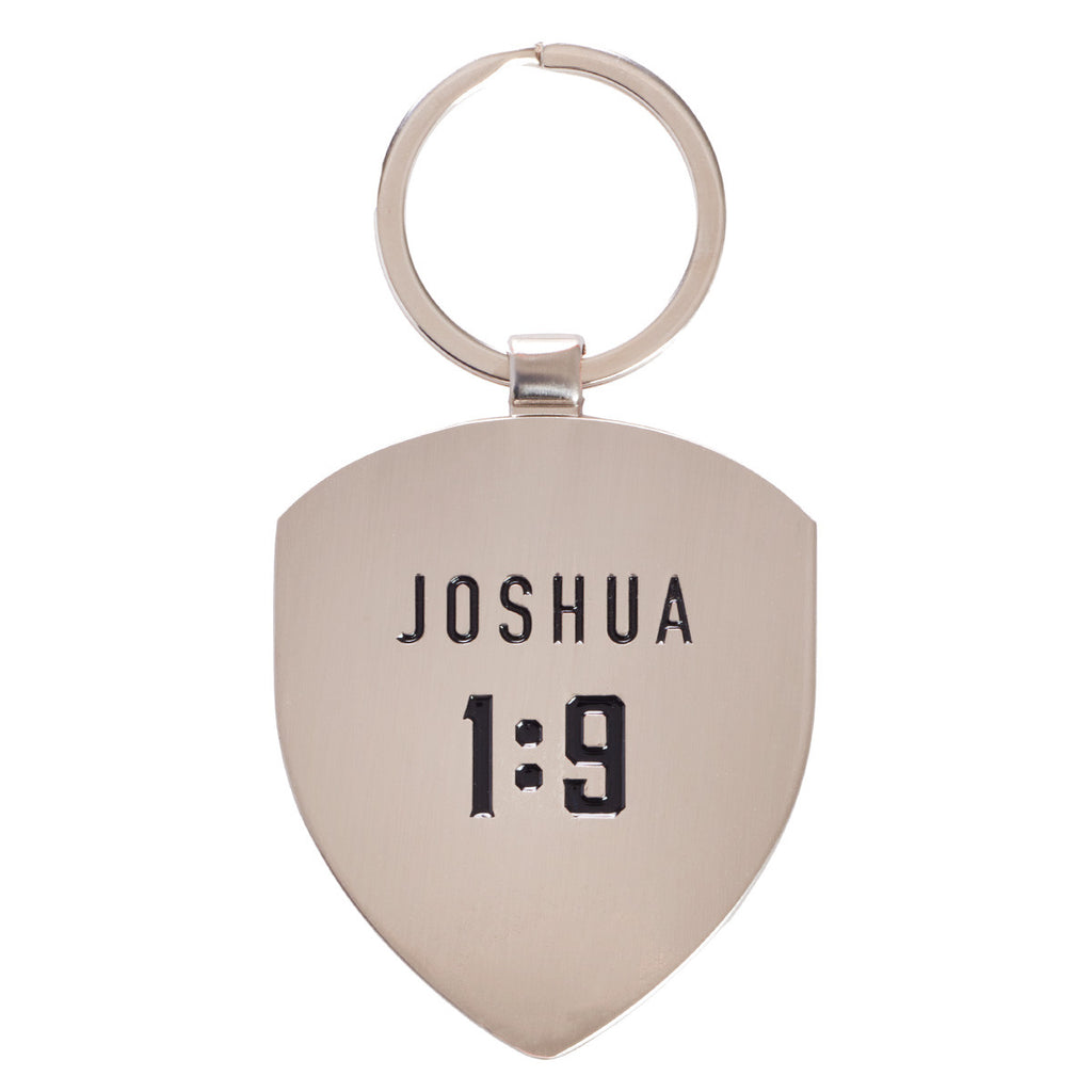 De metalen sleutelhanger: Moed – Jozua 1:9 is een met epoxy gevulde sleutelhanger met het woord "Moed" en een verwijzing naar Jozua 1:9 op de voorkant. De sleutelhanger met Jozua 1:9 heeft ook een leeuwenembleem op een zwarte achtergrond onder de tekst "Moed".