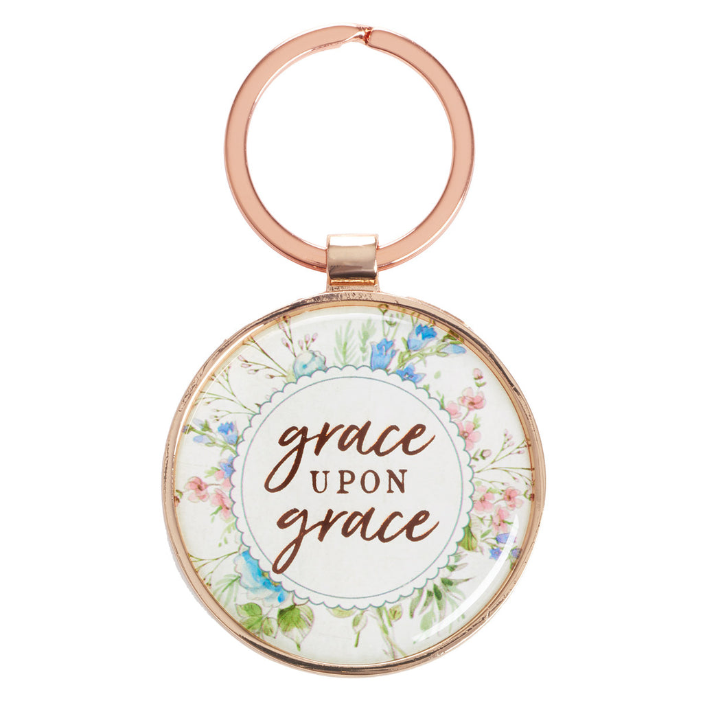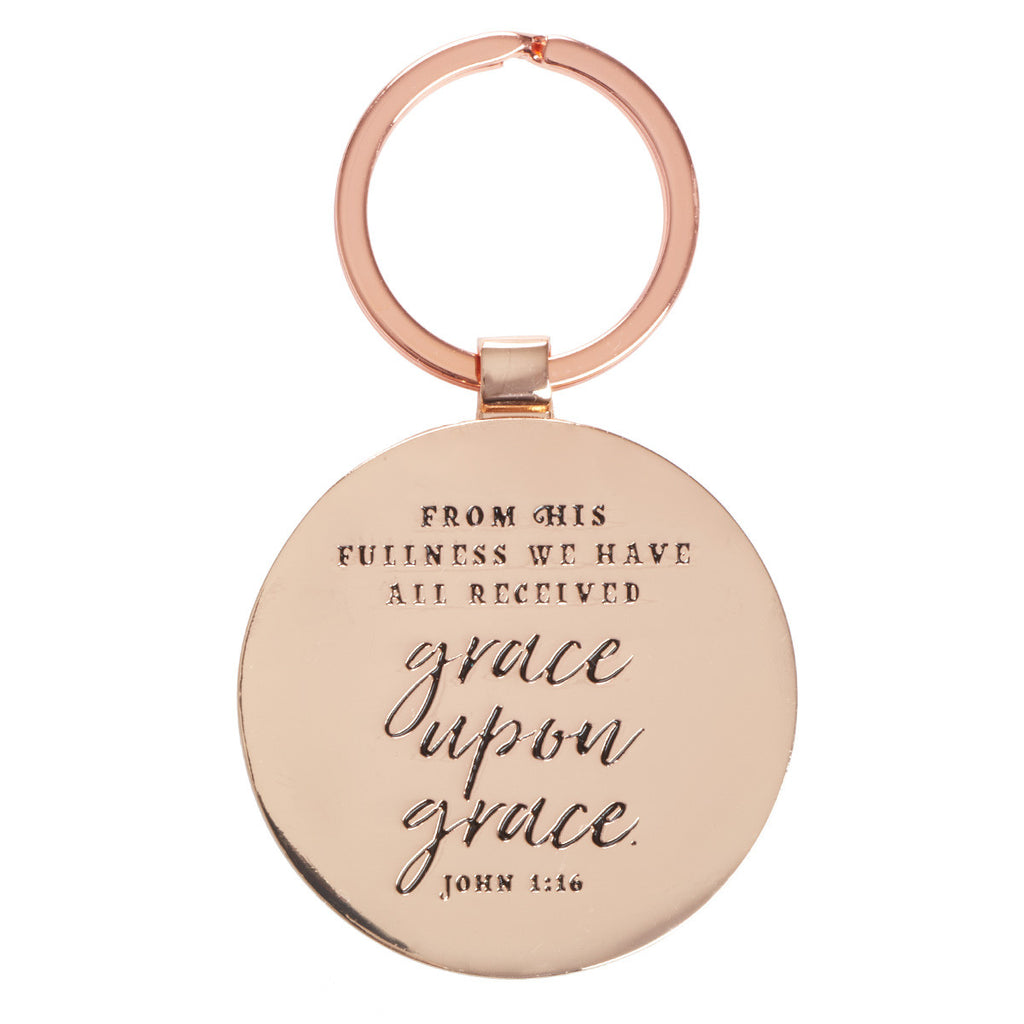 De sleutelhanger in blik met Johannes 1:16 heeft een met epoxy gevulde voorkant met de tekst "Genade op genade" en een gestempelde metalen achterkant met het vers uit Johannes 1:16. Met een aquarel- en bloemenpatroon op de voorkant is de sleutelhanger in blik: Genade op genade – Johannes 1:16 ook ontworpen met een roségouden glans, wat de sleutelhanger met bloemen een extra vleugje charme geeft.
