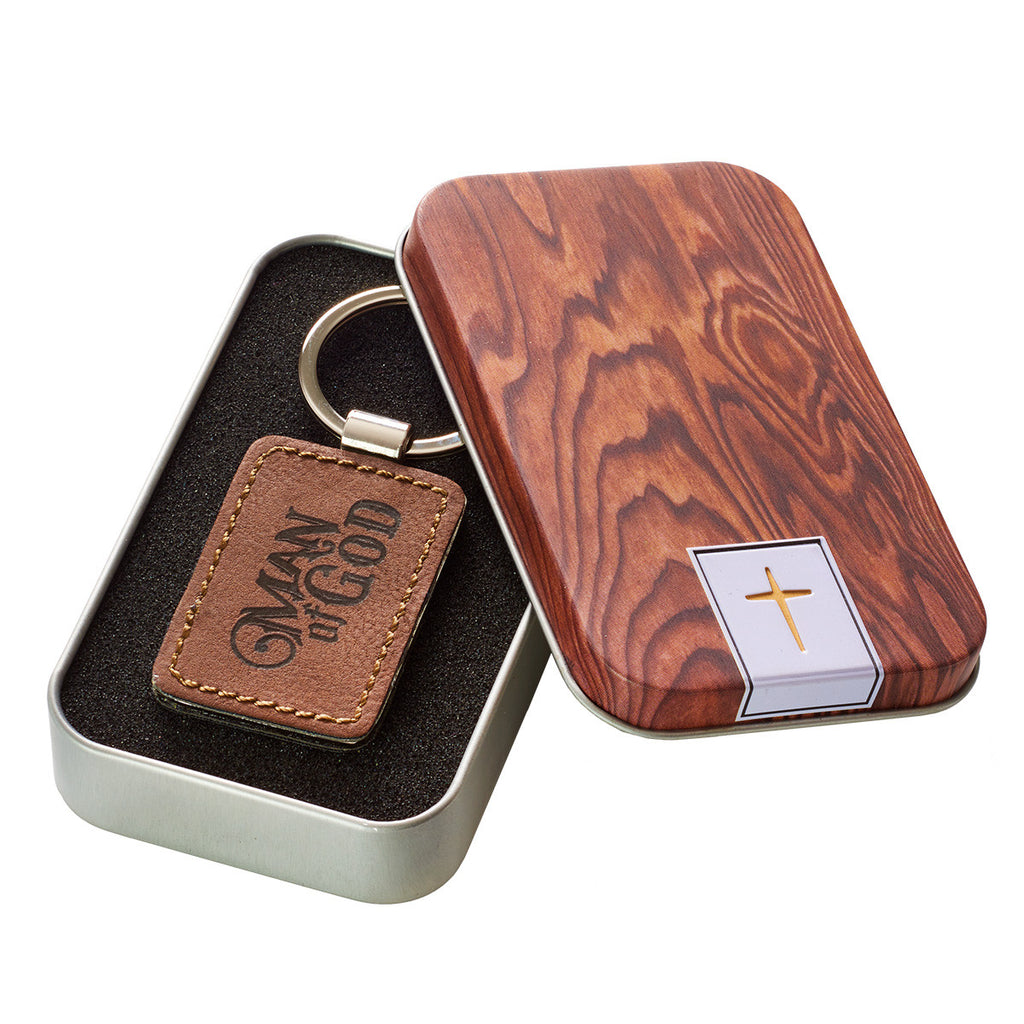 De sleutelhanger in blik van de Man van God is gemaakt van LuxLeather. De bruine sleutelhanger heeft de tekst "Man van God" op de voorkant en een verwijzing naar de Bijbeltekst 1 Timoteüs 6:11 op de achterkant. De sleutelhanger in blik van LuxLeather is rondom gestikt en wordt geleverd in een duurzame matte blikken geschenkdoos met een reliëfontwerp op het deksel.