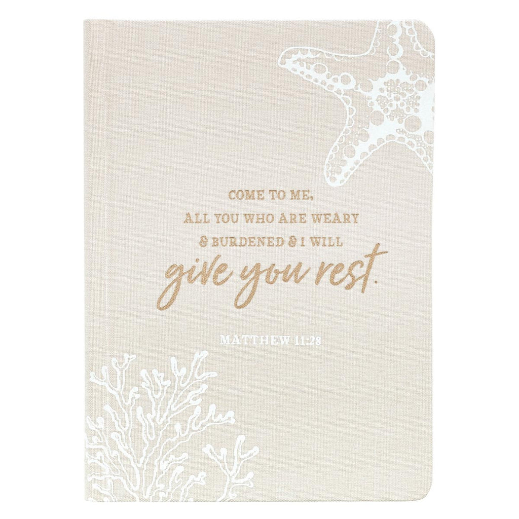 Met 240 gelinieerde pagina's biedt dit dagboek je volop ruimte om je hart uit te storten! Het handige formaat maakt het gemakkelijk mee te nemen. Het Give You Rest hardcover linnen dagboek heeft een leuk, ontspannend strandmotief en de prachtige woorden uit Matteüs 11:28: "Kom naar Mij, allen die vermoeid en belast zijn, en Ik zal u rust geven." De goudkleurige tekst steekt af tegen de natuurlijke linnen tinten, waardoor dit extra "leesbaar" is.