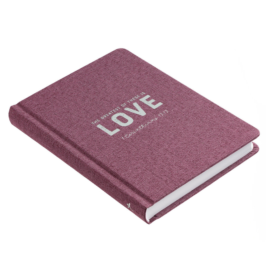 Het hardcover linnen dagboek van Love verwijst naar een van de beroemdste Bijbelteksten ter wereld: 1 Korintiërs 13:13: "Deze drie blijven: geloof, hoop en liefde. Maar de grootste daarvan is de liefde." En nu heb je een plek om je liefdesbrieven aan God te schrijven, gedachten over relaties op te schrijven, mijmeringen te noteren die voortkomen uit liefde en andere emoties, of zelfs je eigen tekeningen te maken om te bewaren.
