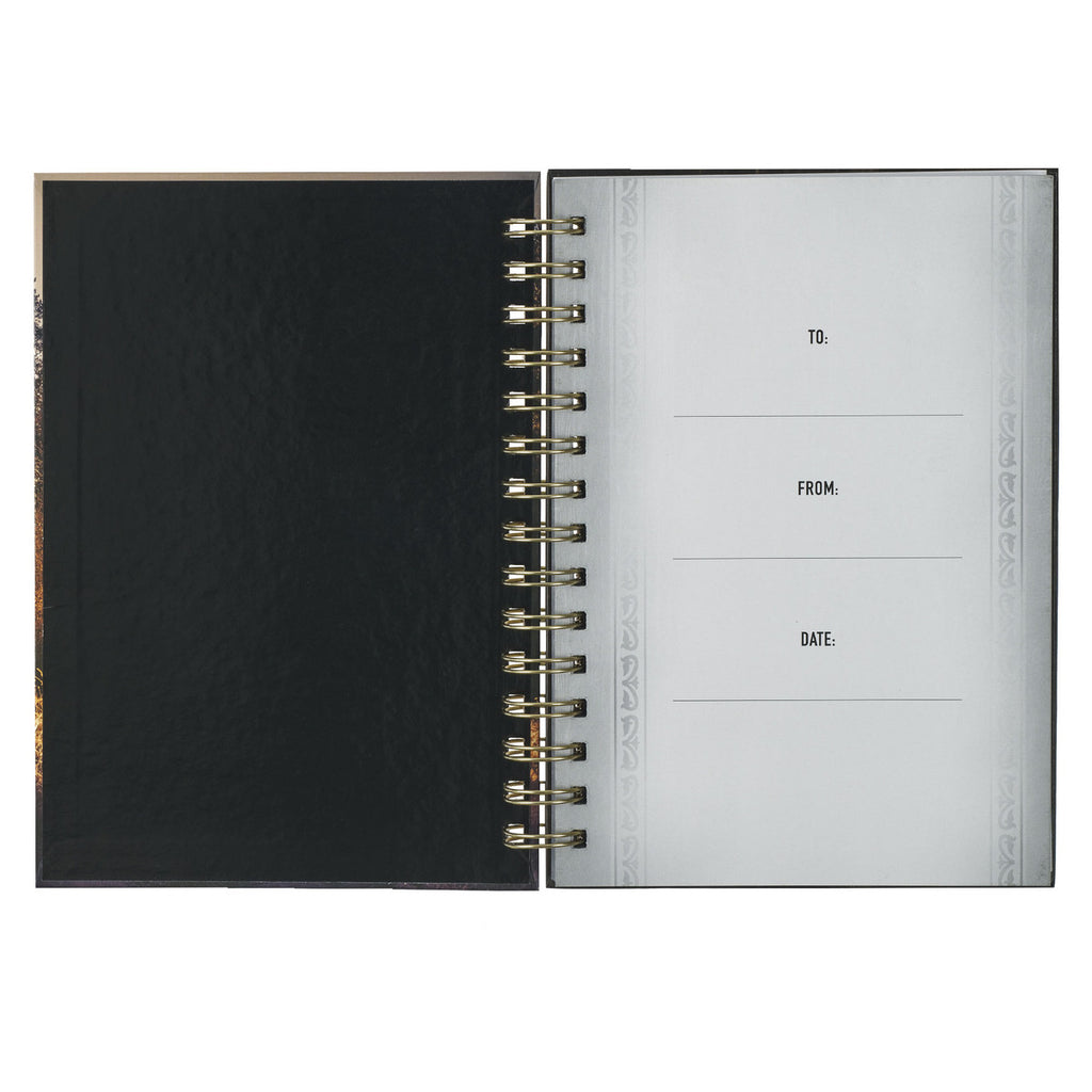 Een onverharde weg nodigt je uit om een donker dennenbos in te gaan op de voorkant van het spiraalgebonden dagboek. Een prachtig vormgegeven, met goudfolie beklede lijst, versierd met een herhalend bladpatroon, harmonieert met de goudfolie-versieringen in de typografische lay-out, waar de titel en versiereferentie in witte zeefdruk zijn aangebracht.