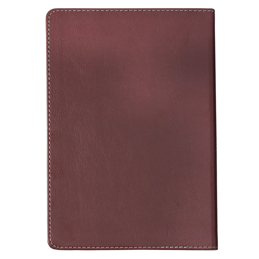 Het tweekleurige bruine LuxLeather-dagboek heeft 400 gelinieerde pagina's en een leeslint om je notities te markeren. De voorkant is voorzien van een lichtbruine strook met een adelaar in reliëf en de tekst uit Jesaja 40:31: "Maar wie op de Heer hopen, krijgen nieuwe kracht. Ze zullen opstijgen met vleugels als arenden; ze zullen rennen en niet moe worden, ze zullen lopen en niet mat worden."