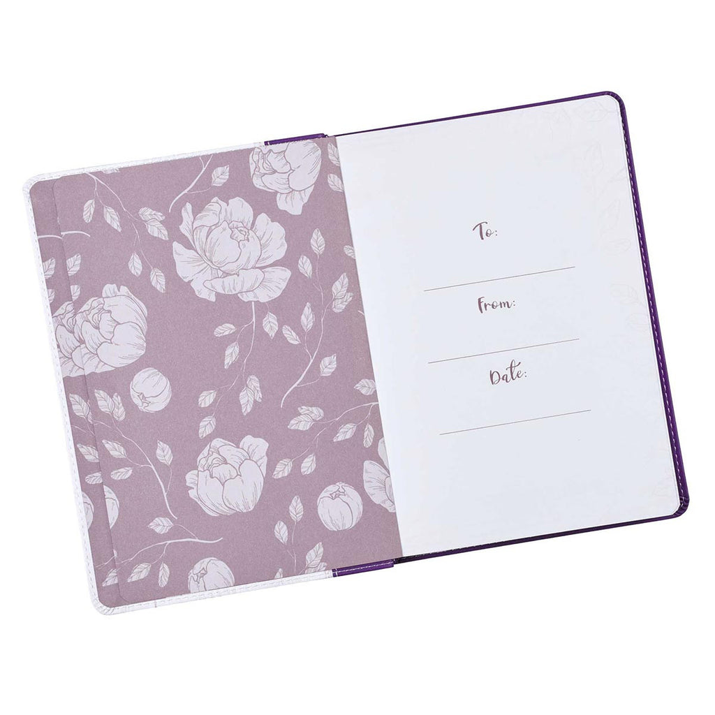 De elegante cover van het Slimline Journal pronkt met een sierlijke krans van vers bloeiende pioenrozen, die mooi matchen met de paarse kleur van het Bijbelvers uit Klaagliederen.