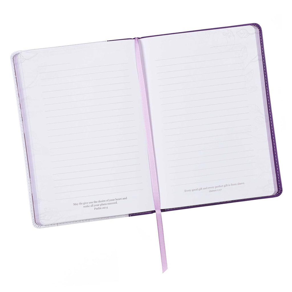 Dit slanke notitieboek is gemaakt van gestikte kunstleren panelen, een paarse achterkant die om de rug loopt en aansluit op een voorkant met een witgekalkt houtmotief. Het notitieboek bevat 240 paarse pagina's met goudopdruk en lijntjes. Een bijpassend zijden leeslint bespaart ruimte en dankzij het slanke formaat past het notitieboek gemakkelijk in uw tas. Dit prachtige notitieboek met flexcover is bedoeld om te vullen met dankbare gedachten en de Bijbelteksten onderaan elke pagina herinneren u aan alles waar u dankbaar voor kunt zijn.