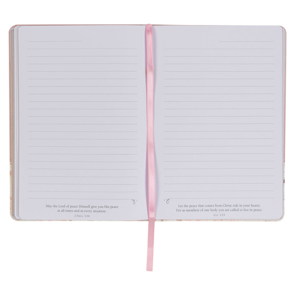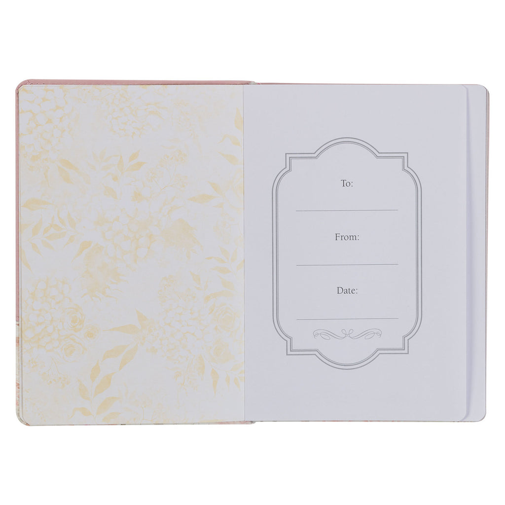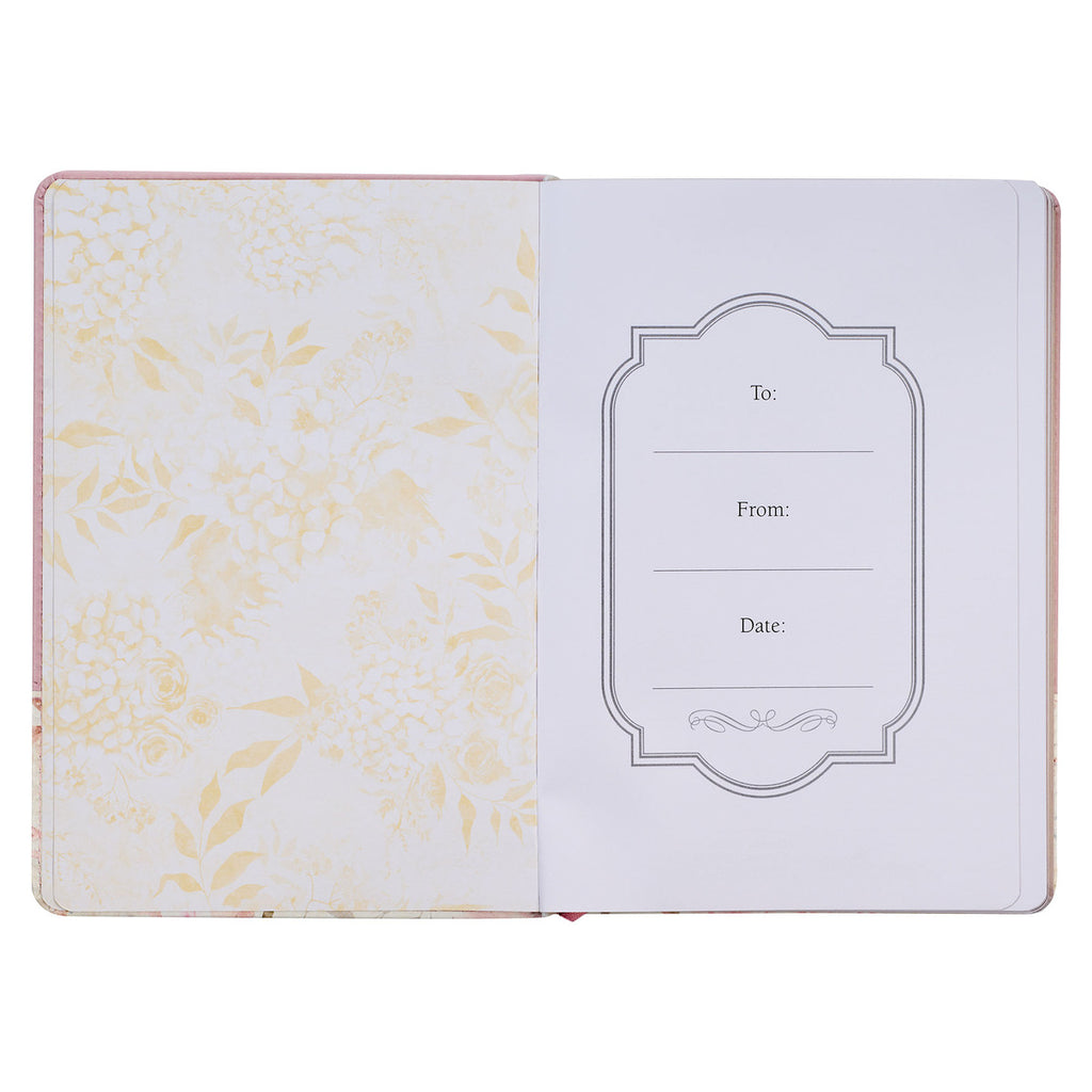 Elke pagina is gelinieerd en heeft onderaan een Bijbelvers. Een roze satijnen lintje markeert de plek waar u gebleven bent. De pagina's zijn gestikt met een Smyth-steeknaad, waardoor het notitieboek volledig plat opengevouwen kan worden zonder de rug te beschadigen. Een handig en uniek kenmerk van dit notitieboek is het in de rugholte ingebouwde inkeping voor een pen.