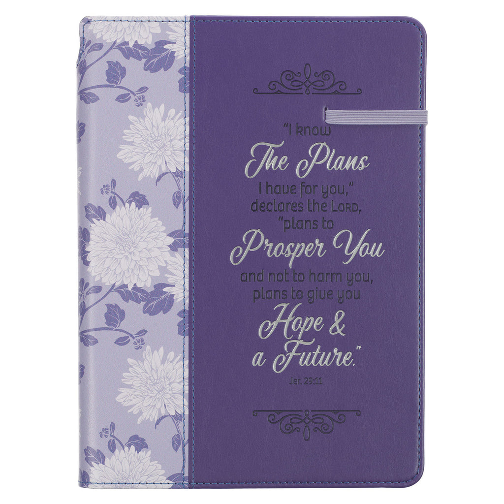 Dit imitatieleren notitieboekje is een prachtig cadeau voor een vriendin die een belangrijke levensverandering doormaakt, een pas afgestudeerde die aan een nieuwe baan begint, of een mentor die je op je spirituele reis heeft vergezeld. Met zijn fraaie design en functionele penhouder biedt het I Know the Plans Purple Floral Classic Notitieboekje met Elastische Sluiting en Penhouder een prachtige setting voor al haar dagboekavonturen.