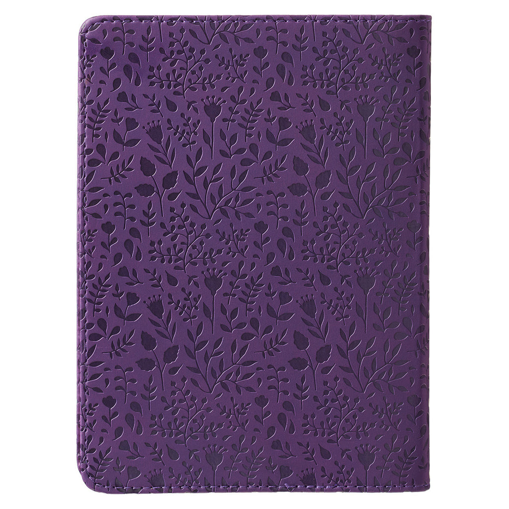 Het handige notitieboekje heeft 240 pagina's – allemaal gelinieerd voor eenvoudig journalen. Onderaan elke pagina vind je een paars Bijbelvers. Deze verzen kunnen worden gebruikt als inspiratie voor journaling of gebed, of je kunt jezelf uitdagen om ze allemaal uit je hoofd te leren. De subtiel vergulde pagina's geven het opvallend paarse ontwerp een extra glans en passen bij het witte satijnen leeslint. Op de presentatiepagina voorin het notitieboekje kun je je eigen naam schrijven of een berichtje schrijven als je het notitieboekje cadeau doet.