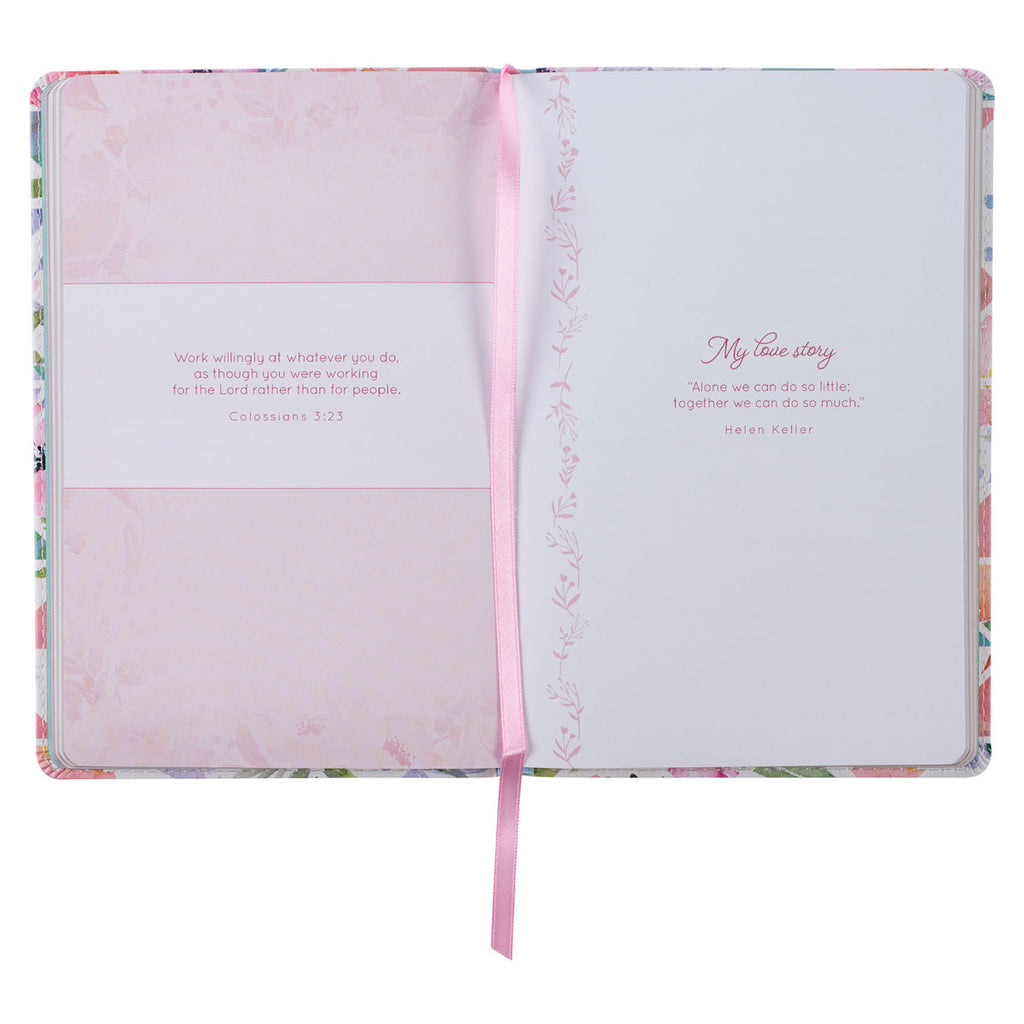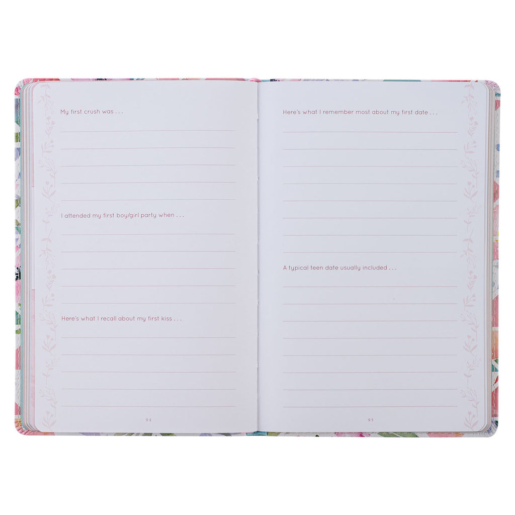Pastelkleurige schutbladen openen naar een presentatiepagina die u kunt personaliseren wanneer u het nalatenschapsdagboek inpakt als cadeau voor een (schoon)moeder. Dankzij het gestructureerde formaat kan een moeder haar nalatenschap opschrijven, terwijl ze haar vroegste jeugdherinneringen deelt, hoe ze haar man ontmoette, de geboorte van haar kinderen en andere belangrijke momenten op haar levenspad. Het dagboek met inspiratie bevat overal bemoedigende Bijbelteksten. Verschillende pagina's met lege regels achterin bieden u de mogelijkheid om nog meer informatie aan het nalatenschapsdagboek toe te voegen.
