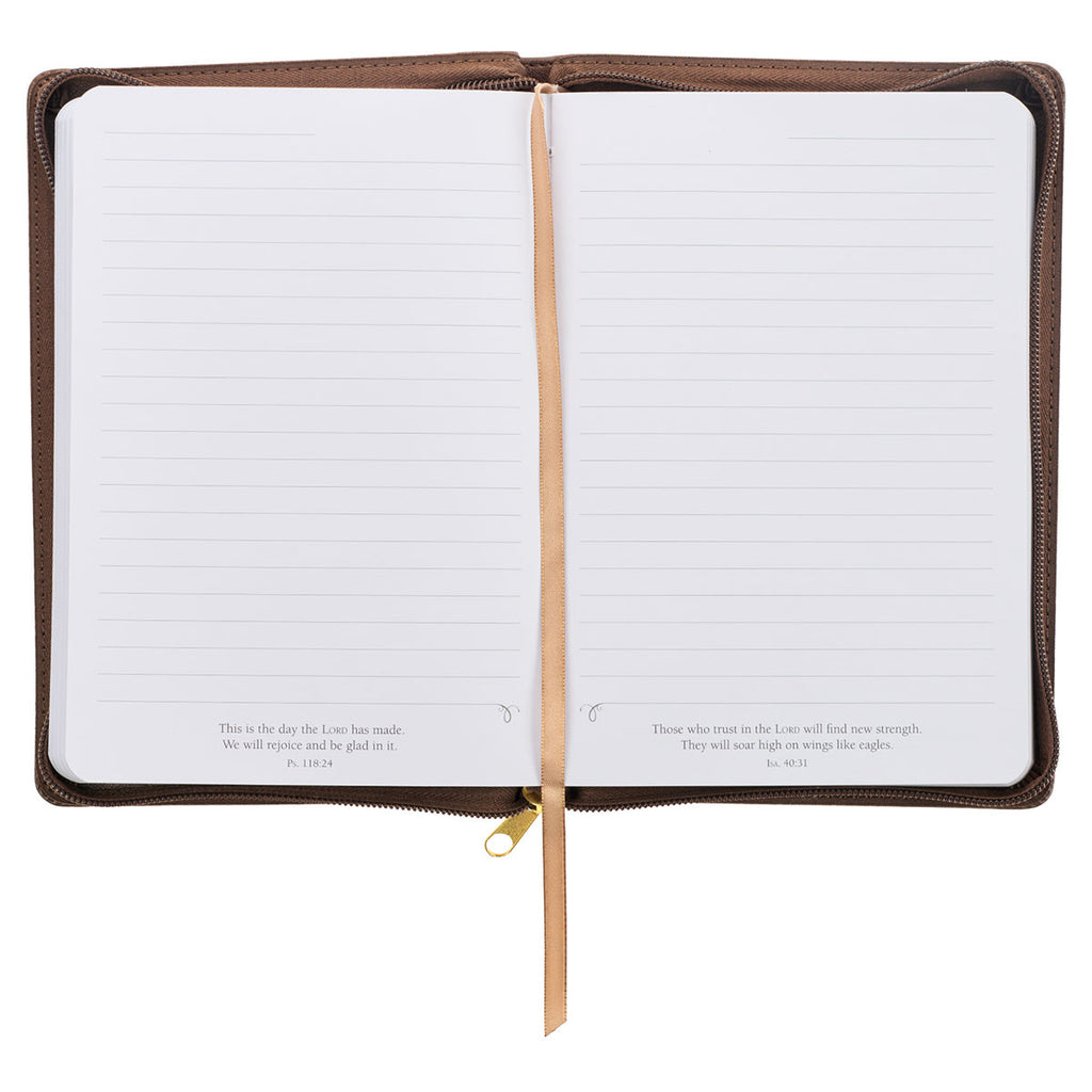 Dit bruine flexcover-dagboek heeft een ritssluiting met een geborsteld gouden ritstrekkertje dat de pagina's beschermt en losse notities veilig op hun plaats houdt. Onderaan elke gelinieerde pagina staat een Bijbeltekst. Het dikke papier voorkomt dat inkt doordrukt en een satijnen leeslint helpt je de laatste notitie snel terug te vinden. Dit dagboek bevat een presentatiepagina om cadeau te doen en is een geweldig cadeau op zichzelf of in combinatie met een pen of bladwijzer.