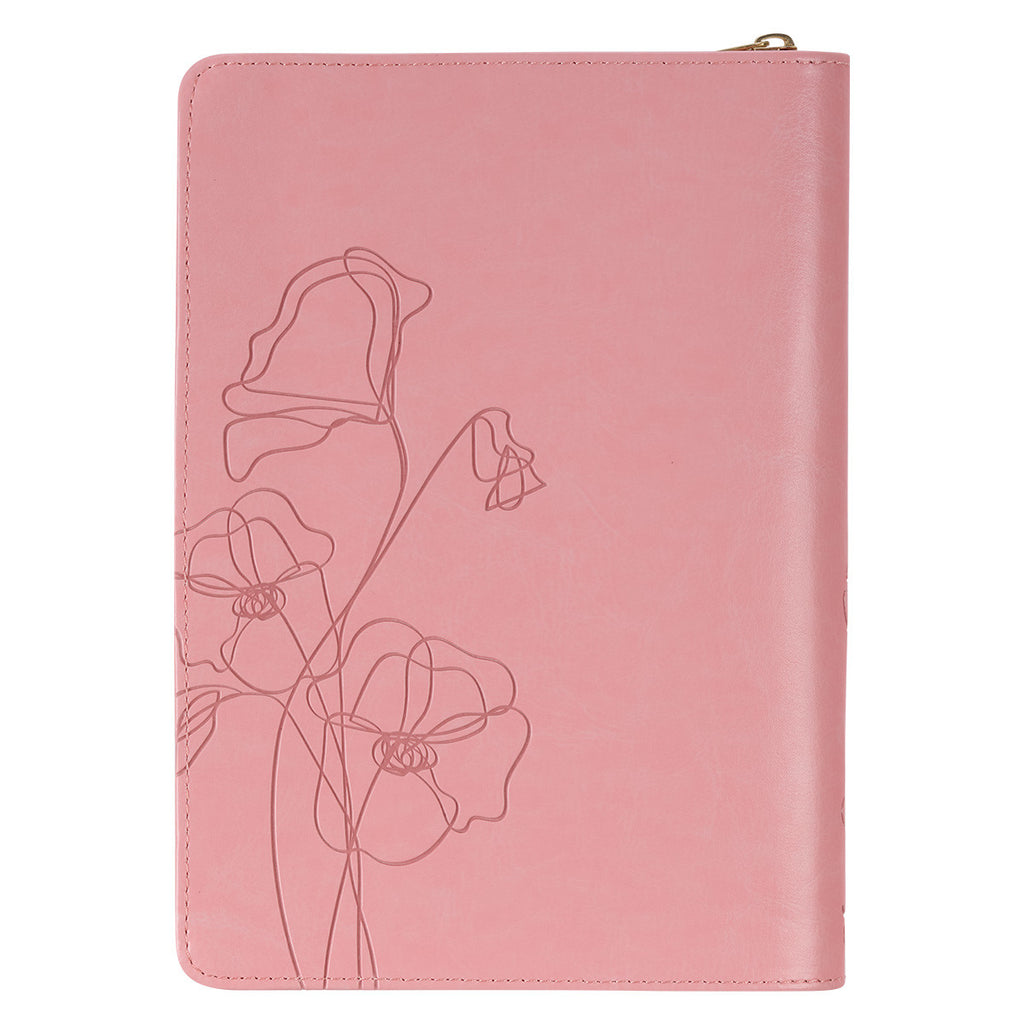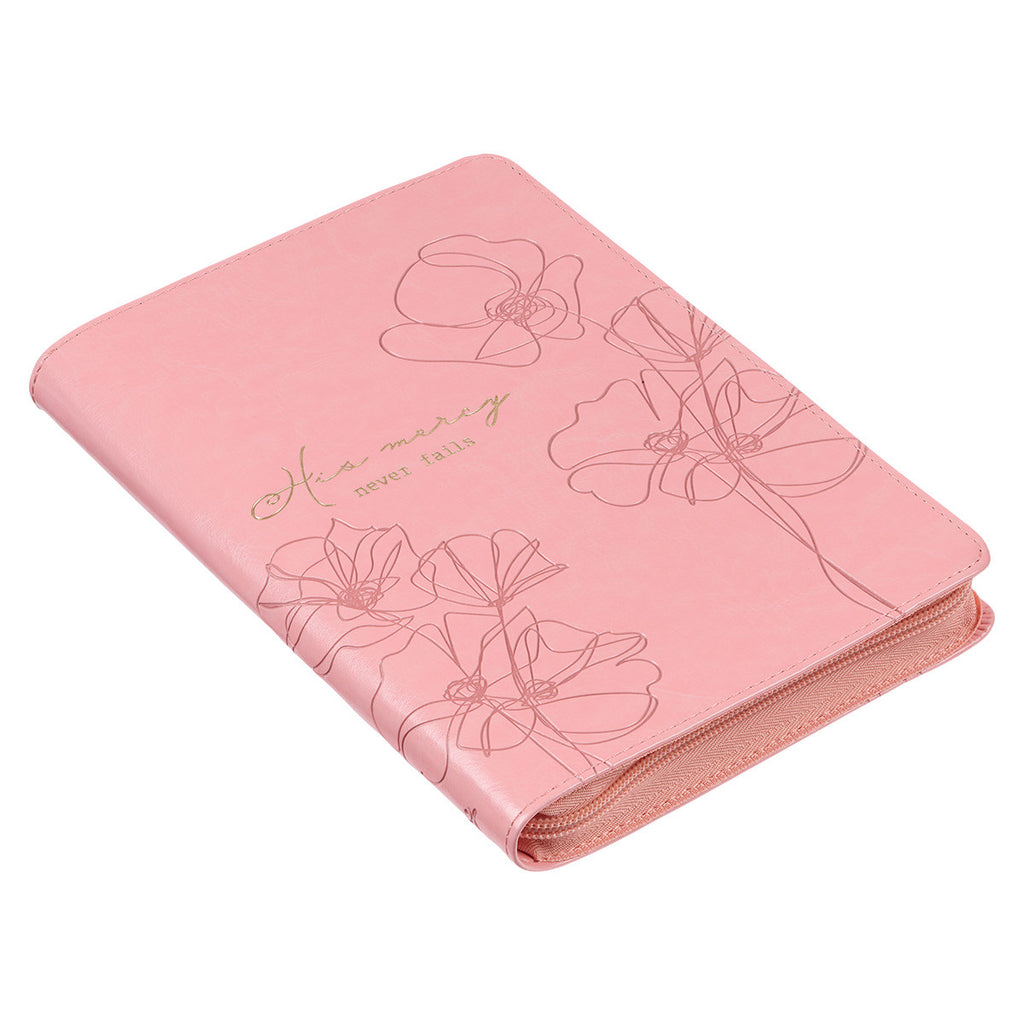 Het Mercy Blossom Pink Kunstleren Notitieboek met Ritssluiting maakt deel uit van de Pastel Meadow Collectie, ontworpen om Gods grote barmhartigheid te vieren en ervan te getuigen. Deze collectie bestaat uit een keramische plantenpot met schotel, een roestvrijstalen waterfles, een magneetset, een grote notitieboekset, een spiraalgebonden notitieboek, een keramische koffiemok, een kunstleren Bijbelhoes en een cadeauzakje.