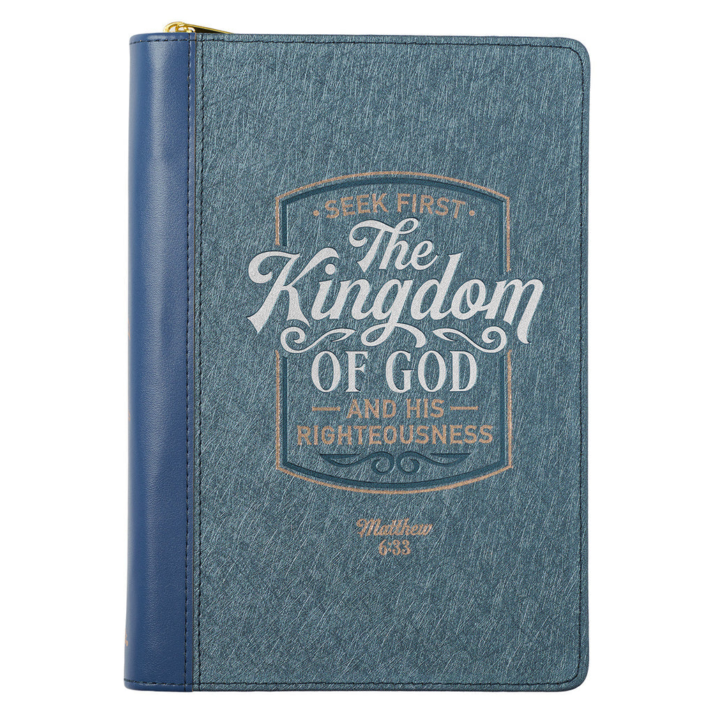 Gebruik de boodschap van het klassieke notitieboek The Kingdom of God in twee kleuren blauw met ritssluiting als een vriendelijke herinnering om je ogen op God gericht te houden en prioriteit te geven aan eeuwige zaken in plaats van aardse zorgen.
