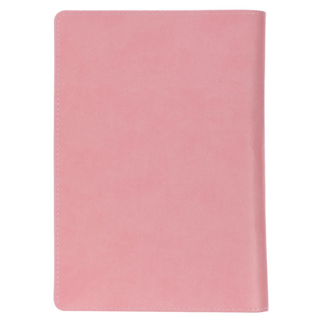De bedrukte voorkant sluit aan op een roze kunstleren paneel dat om de rug loopt en de achterkant vult. Doorgestikte randen garanderen een kwaliteitsproduct en zorgen voor een roze rits met een gouden ritstrekker, zodat alle losse papieren en bladwijzers veilig opgeborgen zijn.