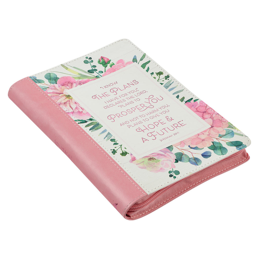 Denk na over Gods plan voor uw leven terwijl u uw dromen en hoop opschrijft in het klassieke notitieboekje The Plans Pink Bouquet Faux Leather Classic Journal met ritssluiting.