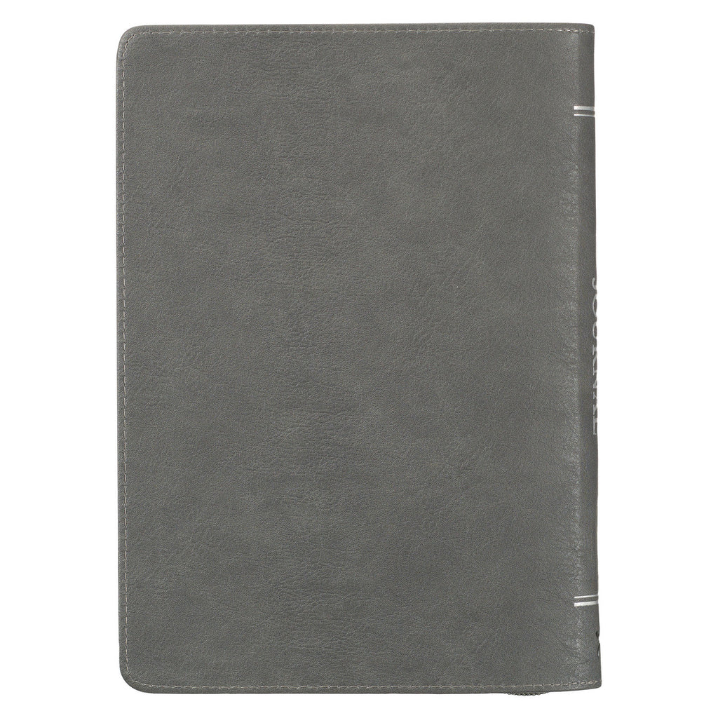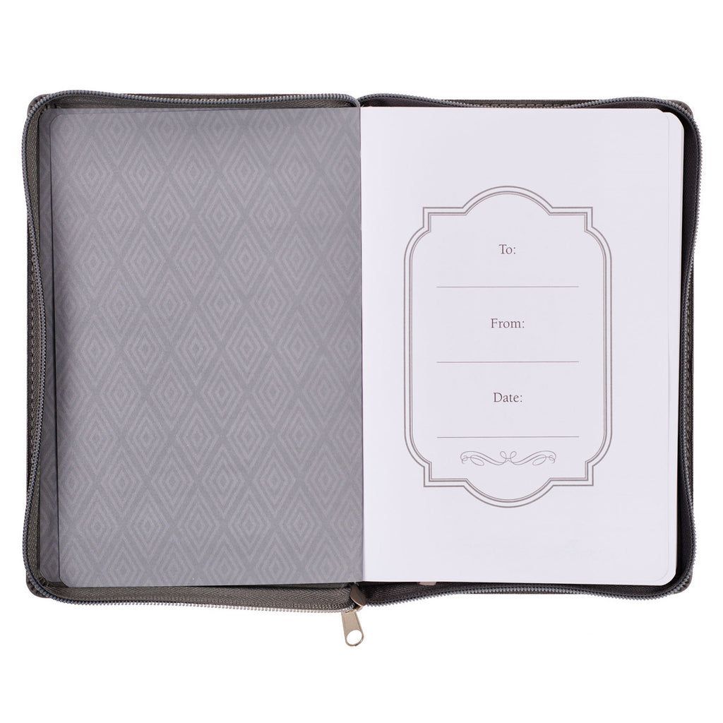 Grijze stiknaden langs de randen verstevigen de kaft en een grijze rits met een zilverkleurige metalen ritstrekker houdt je pen en belangrijke papieren veilig in het dagboek. Tijdens het schrijven fungeert het grijze leeslint als tijdelijke aanduiding. Mediteer over de bemoedigende Bijbelteksten onderaan elke pagina en gebruik ze als gebed of als inspiratie voor je dagboek. Personaliseer het dagboek met een oprechte boodschap op de presentatiepagina wanneer je het cadeau geeft.