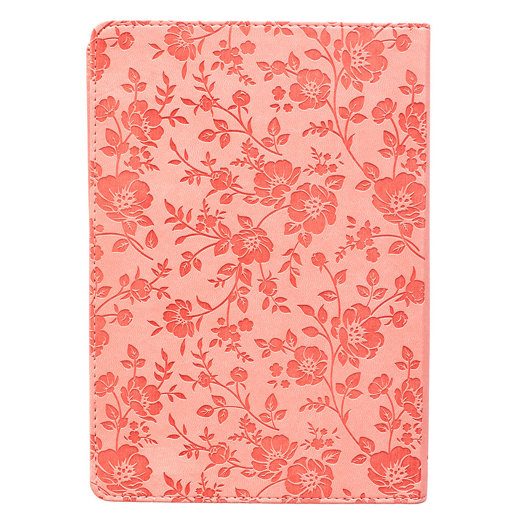 De koraalkleurige kaft van imitatieleer heeft een luxueuze uitstraling en het slanke notitieboek is dun genoeg om gemakkelijk in een tas of rugzak te passen. Eenvoudige stiksels langs de randen maken de algehele look van dit notitieboek compleet. Het notitieboek is voorzien van een satijnen lint als placeholder en heeft een vergulde rand en gelinieerde pagina's met Bijbelteksten ter overdenking onderaan elke pagina.
