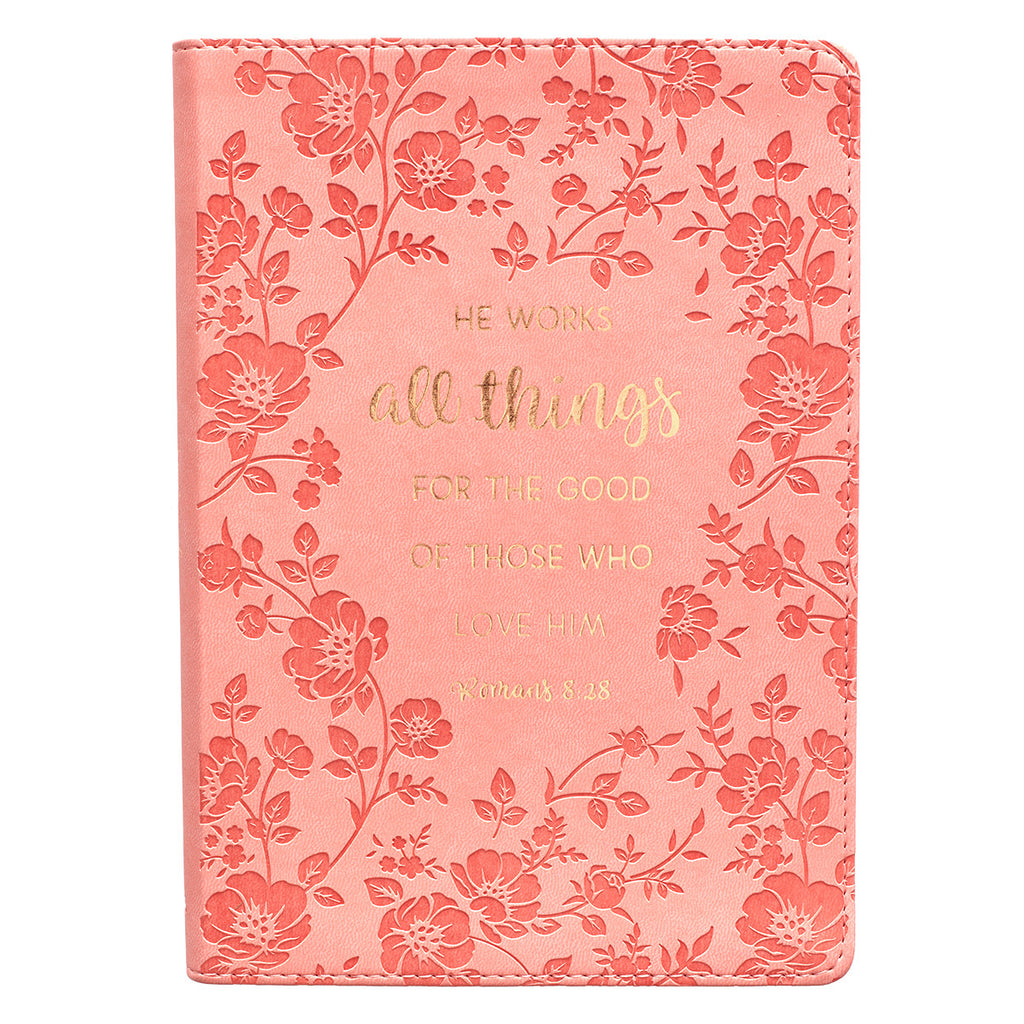 Het flexibele notitieboek is voorzien van tekst uit de Romeinen, gegraveerd met goudfolie op een prachtige koraalkleurige kaft van imitatieleer. De tekst is geplaatst in een vloeiende vignette, omringd door een ingewikkeld bloemenmotief dat ook op de achterkant terugkomt.