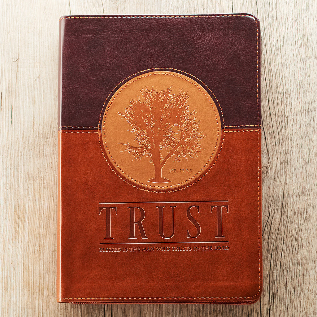 Een opvallend contrast is de "Trust" driekleurige notitieboek met rits en flexcover. De notitie heeft een symbolische boom gegraveerd in het zandbruine middenstuk aan de voorkant, aangevuld met een opvallende mix van zadelbruin en rijke bruine banden. "Trust" en de eerste regel van de Schrift uit Jeremia 17:7, "Gezegend is de mens die op de Heer vertrouwt", zijn in reliëf op de voorkant aangebracht en de volledige tekst van hoofdstuk 17, vers 7 en 8, is op de achterkant gegraveerd.