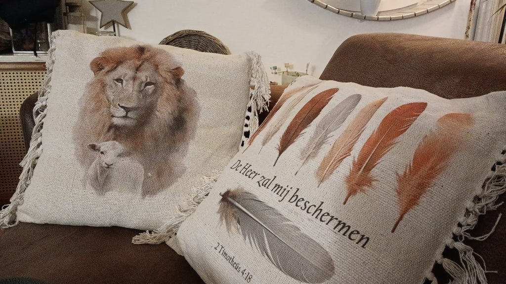 Toon je vertrouwen op de Heer met dit kussen. Gebruik het als accentkussen op een bank, stoel of bed. Het vierkante katoenen kussen met print heeft een vulling van 100% polyester en meet 45x45 cm.
