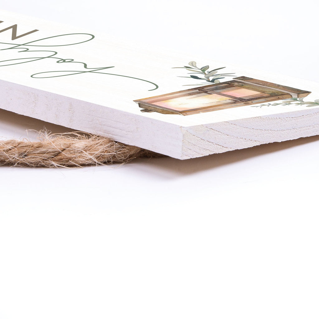 Hangend kerstdecoratiebord met een dennenhouten lat aan jute touw. Lantaarnkunstwerk met bladmotief en tekst.