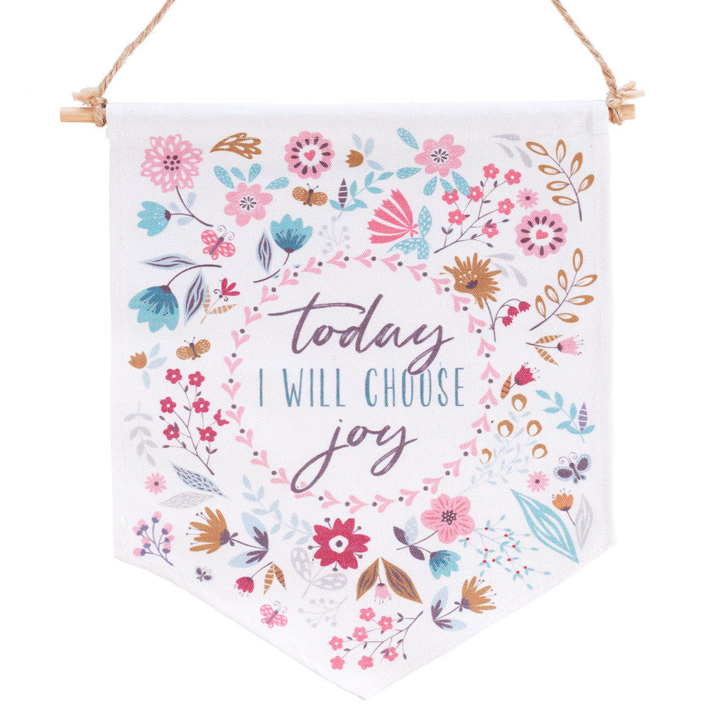 De stoffen wanddecoratie Choose Joy wordt geleverd met een bamboestok en een ophangkoord. "Vandaag kies ik voor vreugde" staat centraal op de stoffen wanddecoratie in bannerstijl. Een bloemenpatroon omringt de wanddecoratie.