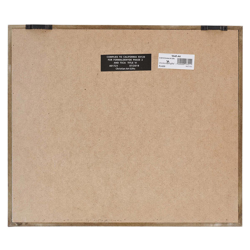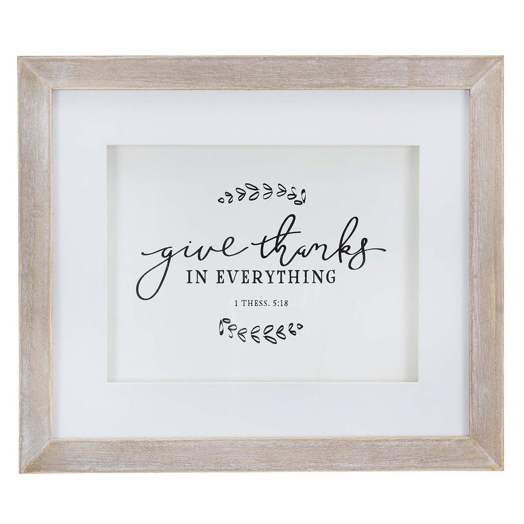 De tekst "Dank in alles" komt uit 1 Thessalonicenzen 5:18. Het wandkunstwerk heeft een glazen overlay en is ingelijst in een witgekalkte houten lijst. Ophangmateriaal is inbegrepen, waardoor dit kunstwerk gemakkelijk op te hangen is.
