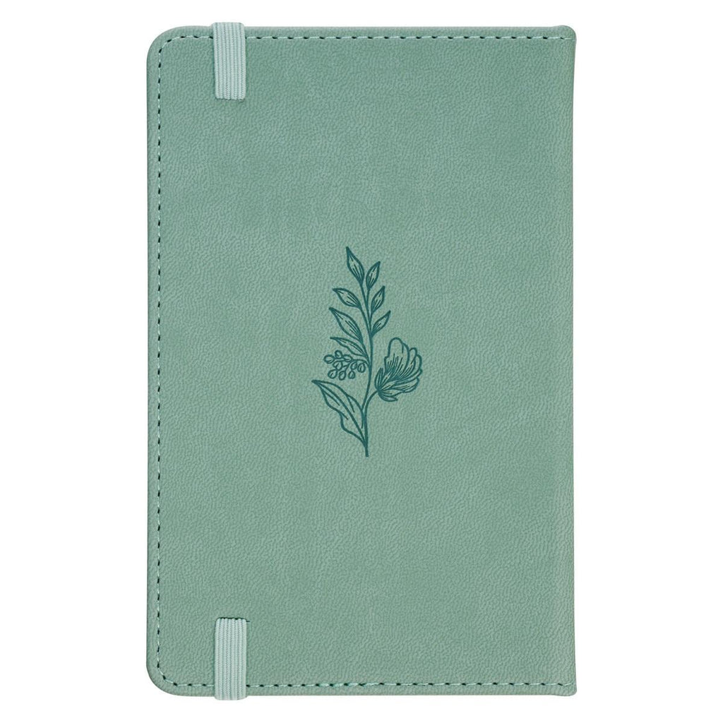 The hardcover notebook is wrapped in a peaceful teal faux leather. A simple floral design is heat-debossed in the center of the front cover. Below the design, the sentiment is gold-foiled and the Scripture reference is heat-debossed below it.