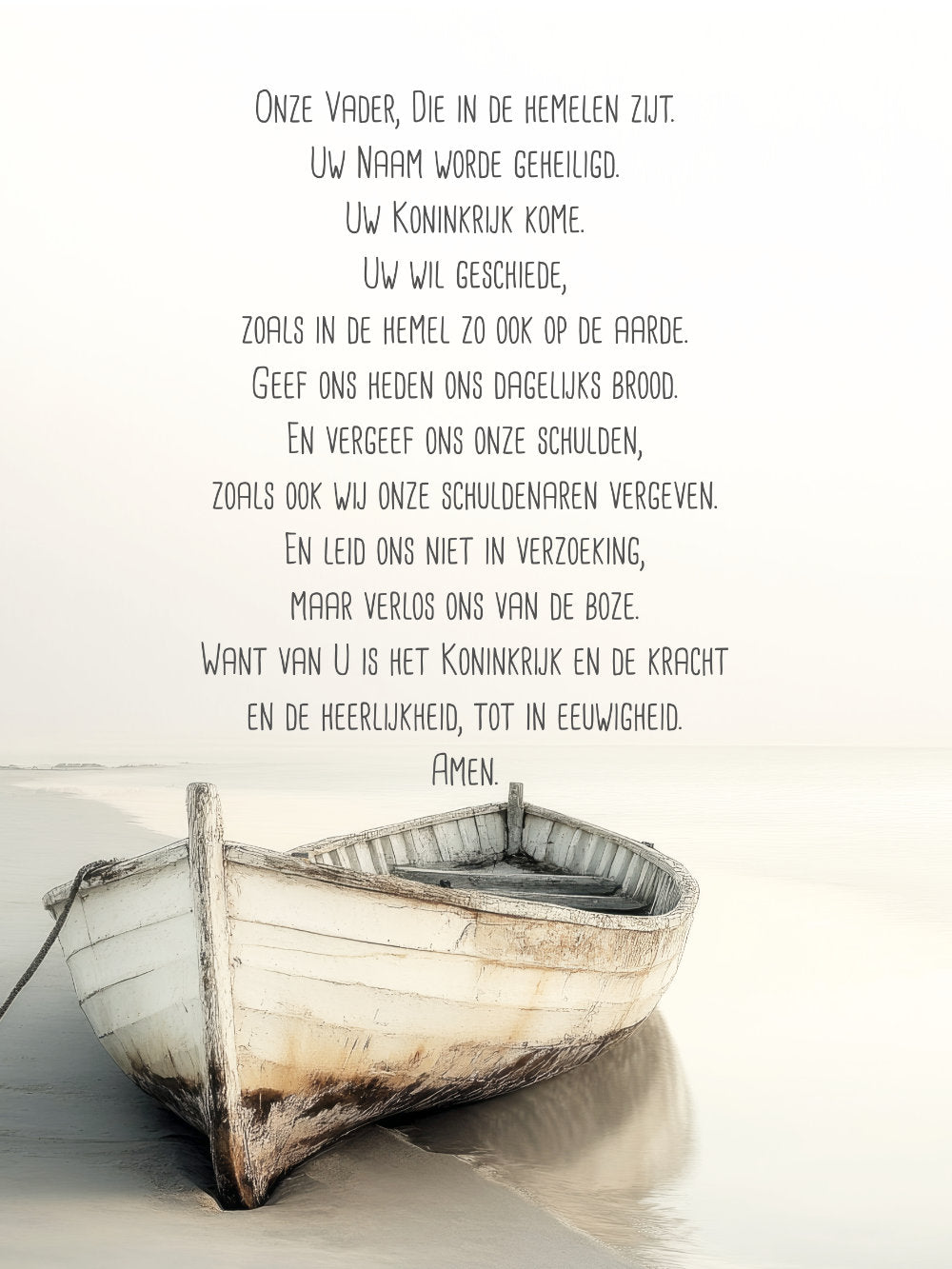 Dit stijlvolle A6-journal (9,5 x 14,5 cm) is een praktisch notitieboek voor dagelijks gebruik. De kaft is gemaakt van zacht wit kunstleder, en geeft een soepele feel. Op de voorkant staat de tekst van het Onze vader met een verstilde weergaven van een boot op het strand.