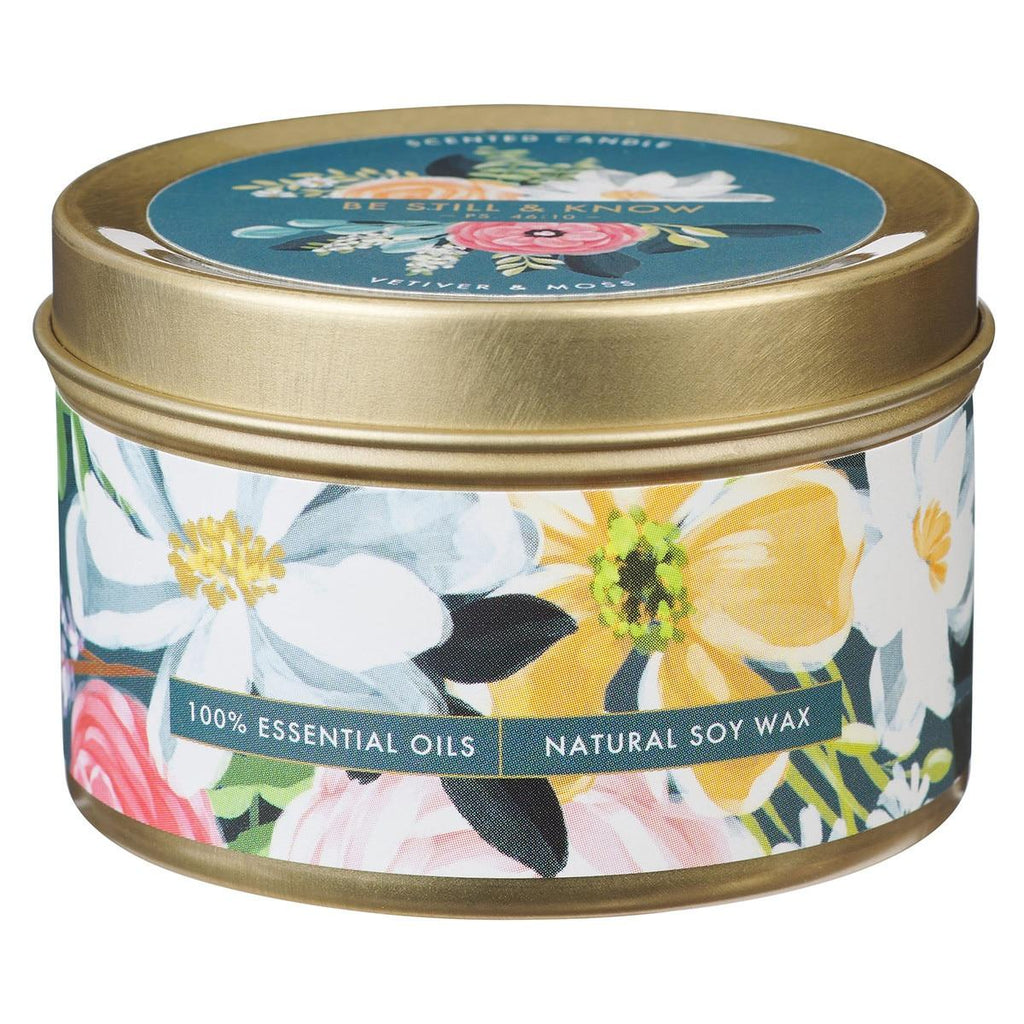 The Be Still and Know Vetiver and Moss Candle in a Tin coordinates with other items in the Ally collection, which features artwork by Allison Loveall. This collection includes a die-cut magnet, a scented candle in a glass jar, a faux leather luggage tag, a faux leather bookmark, a faux leather checkbook wallet, a faux leather journal, a wirebound journal, a stainless steel travel tumbler, a KJV note-taking Bible and a gift tag.