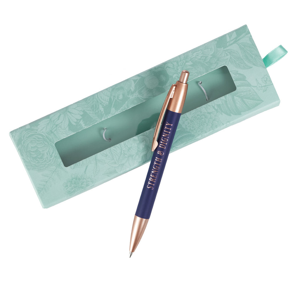 De Spreuken 31:25 Pen Cadeauset kan zelfs vragen oproepen bij mensen in haar leven die de marineblauwe pen opmerken, wat haar een geweldige kans biedt om met hen te delen wie God is. De Spreuken 31:25 Pen bevat een deel van de boodschap uit het vers "Kracht & Waardigheid" op de roségouden geschenkpen, volledig in hoofdletters. De onderkant van de Strength & Dignity Pen is marineblauw, met de punt, clip en de tekst in een trendy roségouden kleur.