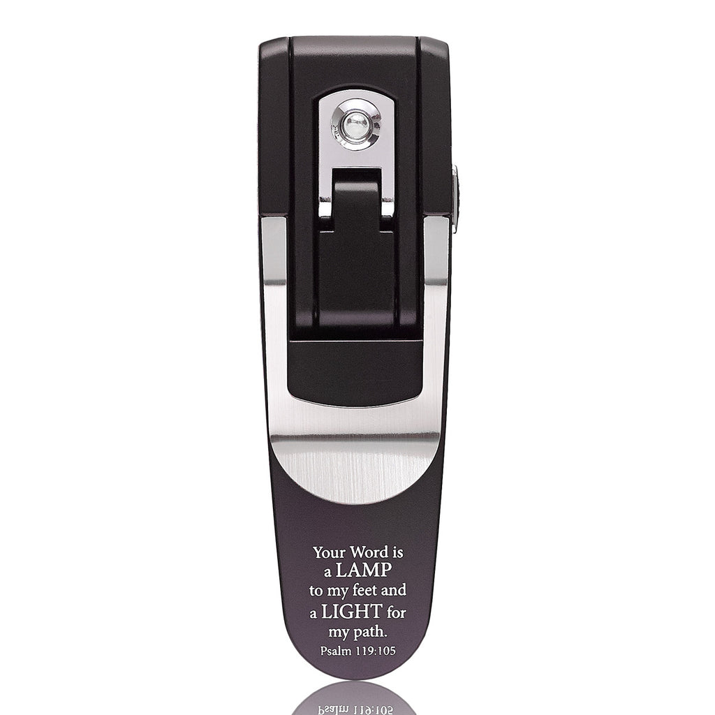 De zwarte pop-up boeklamp is een handig accessoire voor lezers thuis en onderweg. Hij is licht en compact, maar ook duurzaam en doet zijn werk goed. De clip blijft aan de achterkant van je Bijbel of boek zitten, of blijft gewoon op tafel staan als je dat liever hebt. Het mooiste is dat de paarse boeklamp met één druk op de knop uitklapt, zichzelf aanpast en aangaat om je het perfecte extra licht te geven tijdens het lezen. Deze leeslamp is zelfs voorzien van de prachtige tekst uit Psalm 119:105, waarin staat dat Gods Woord een lamp en een licht voor ons is. Klap de lamp eenvoudig weer dicht om hem uit te schakelen.