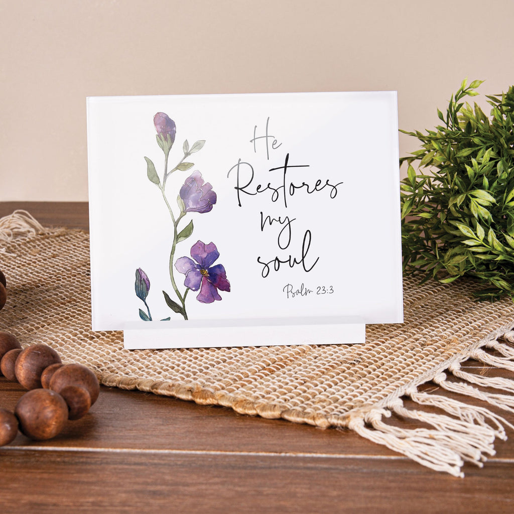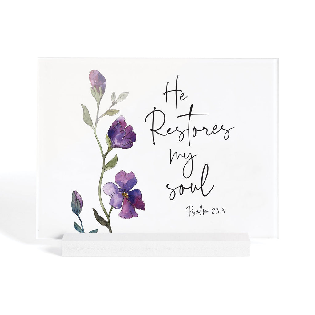 Tekst: Hij herstelt mijn ziel, acrylbord met houten voet