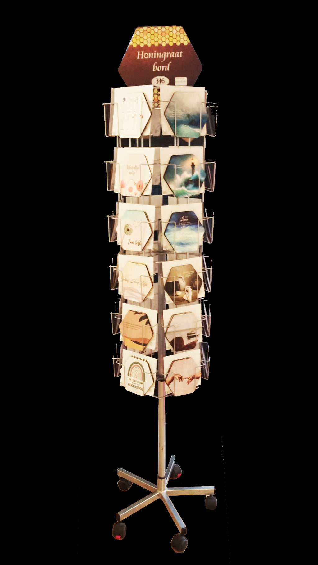 Deze kaartenmolen biedt niet alleen een prachtige manier om honingraatbordjes te presenteren, maar ook een handige manier om ze te verkopen. Klanten kunnen gemakkelijk bladeren en hun favoriete boodschappen kiezen.