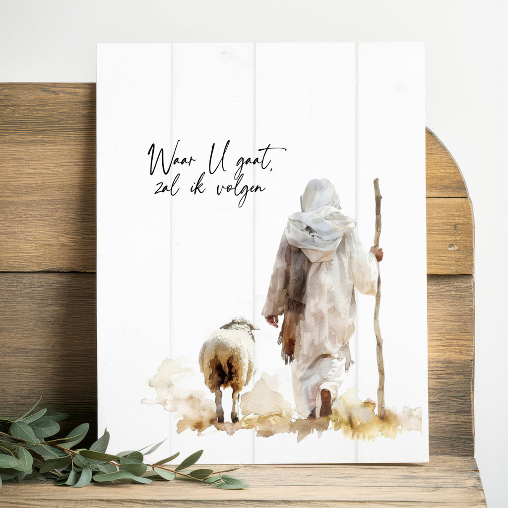 Het bord is voorzien van een verstelde afbeelding van de Herde met een schaap van zijn kudde.