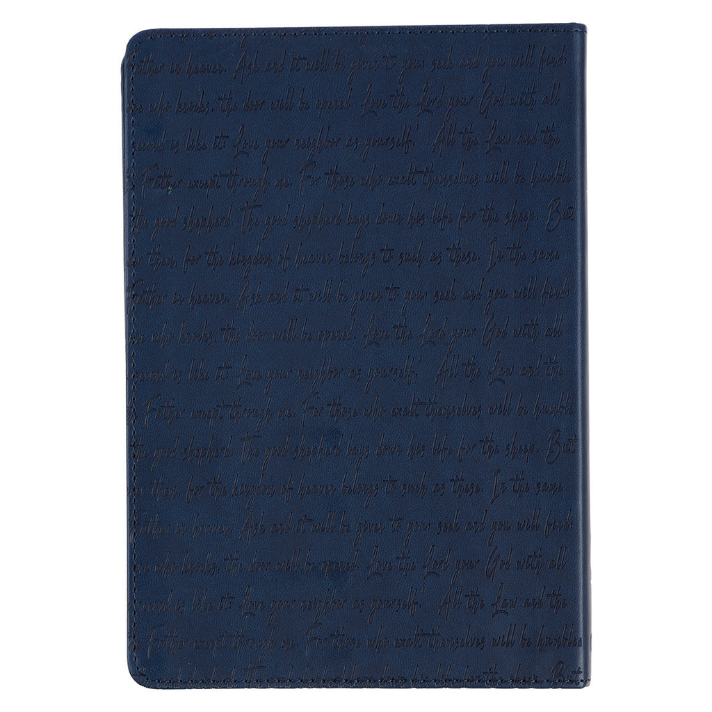 The blue faux leather cover is heat-debossed with quotations from the words Jesus spoke while walking the earth. The title and sub-titles are heat-debossed and foiled in gold.